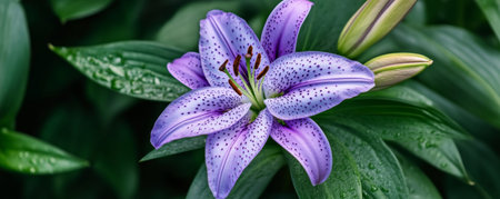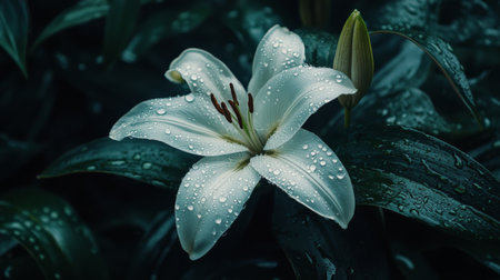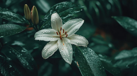 A delicate lily with droplets of water on its petals, reflecting light and color, surrounded by lush green leaves, creating a beautiful nature composition