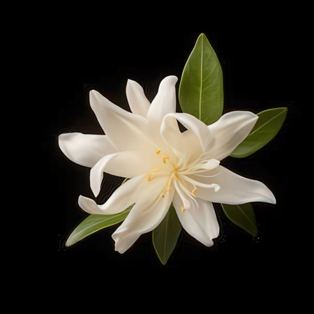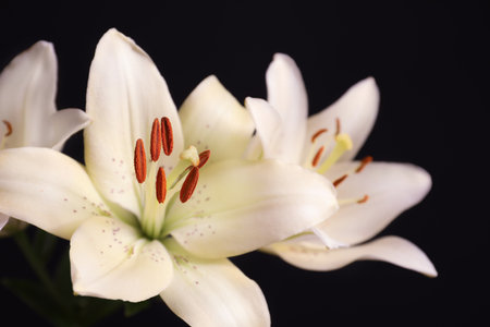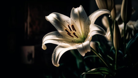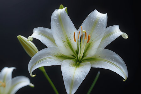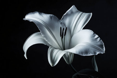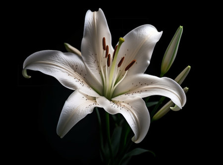 Elegant white lily on a black background showcasing its delicate petals and striking contrast, perfect for nature and floral themed projects