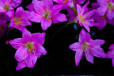 Pink color Rain Lily flower blooming in rain season on dark background with space for text.