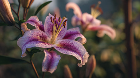 A stunning photo of vibrant pink lilies blooming in a serene garden at sunset, capturing the beauty of nature's colors and the elegance of floral life.