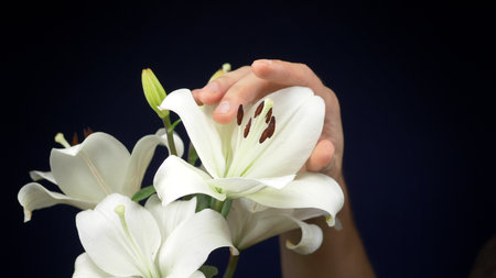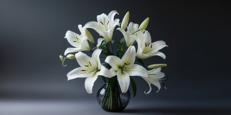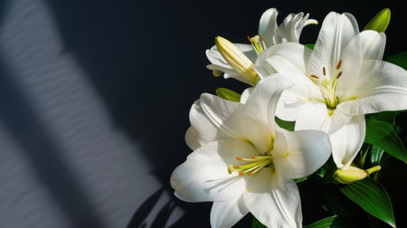 AI Generated. Elegant White Lily Bouquet Over Dark Backdrop with Copy Space