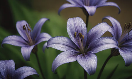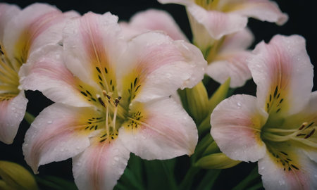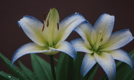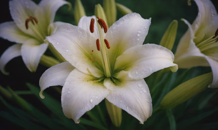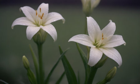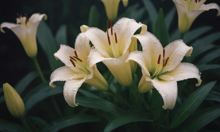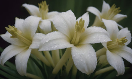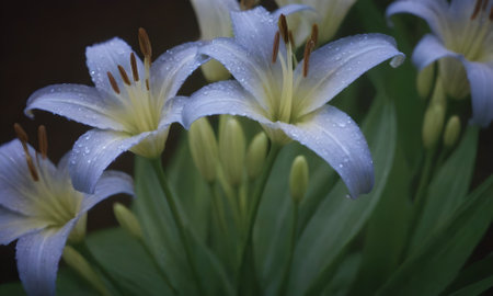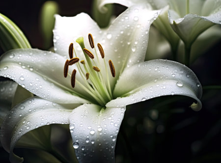 Stunning close-up of white lilies adorned with water droplets, captured in soft light. This image radiates natural beauty and elegance, ideal for floral themes.