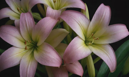 Elegant pink lilies with delicate petals on a dark background, exuding a sense of tranquility and beauty