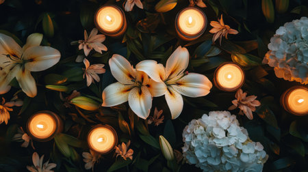 A beautiful funeral garland made of lilies and hydrangeas, surrounded by soft candlelight in an overhead shot