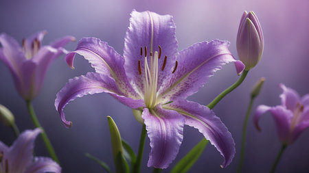 Detailed image of a lily flower, displaying a mix of white and purple hues on its petals, with prominent stamens extending outward. Perfect for garden catalogs or environmental awareness content.