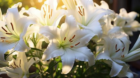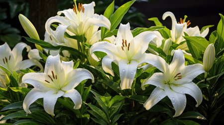 A stunning display of white lilies bathed in natural light creates a serene ambiance. Soft shadows enhance their beauty against a dark background, adding elegance.