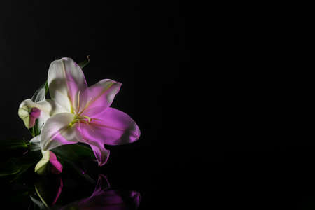 Lily flower on the dark background. Condolence card. Empty place for a text