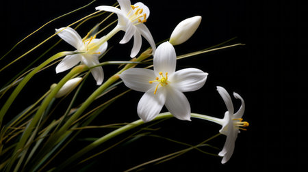 white flowers bloom against a striking black backdrop, reminiscent of national geographic's captivating photography. this image exudes religious symbolism and draws inspiration from the works of vladimir tatlin. it is a joyful celebration of nature, beautifully captured by the talented photographer miwa komatsu. the transcendent beauty of these flowers evokes the artistic spirit of the ancient shang dynasty. ai generated