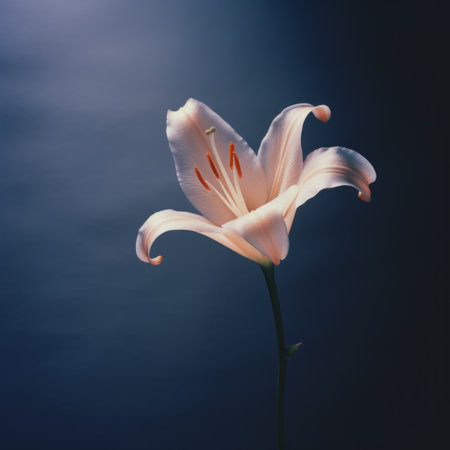 a single yellow lily stands out against a background of dark sky-blue and light pink. the minimal retouching enhances the delicate flora depiction, while the dark blue and white elements add depth. this stunning photo captures the realistic depiction of light, with a touch of light pink and white. ai generated