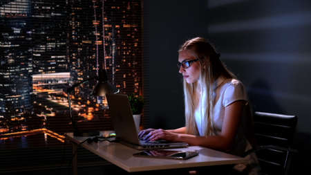 Woman with glasses and wireless headphones surfing the internet while it is night, the computer screen is reflected in her glasses.