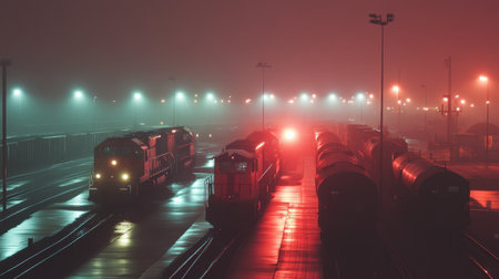 A captivating view of trains in an industrial area during foggy night. The soft illumination casts an eerie glow, creating a serene yet mysterious atmosphere.