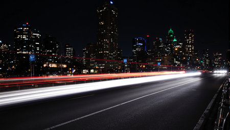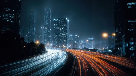 This stunning nighttime cityscape captures vibrant light trails from moving traffic, showcasing the beauty of urban life with a dynamic skyline in the background.