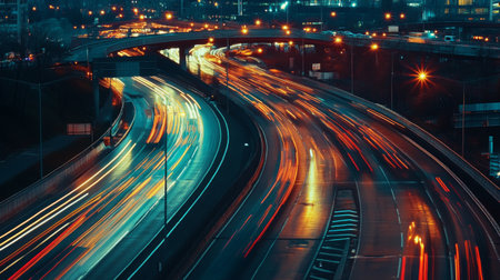Captivating long exposure photograph capturing vibrant light trails of traffic on an urban highway at night, showcasing movement and energy in city life.