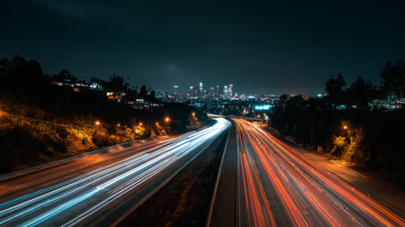 Captivating nighttime view of a bustling Los Angeles highway, showcasing vibrant car light trails against a stunning urban skyline in the distance.