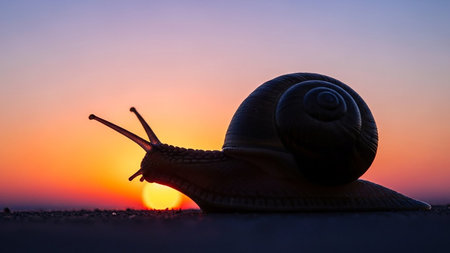 A snail in silhouette crawls on the ground against a colorful sunset sky. Clear details and vibrant colors enh...