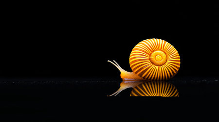 A snail with a vibrant yellow and brown striped shell, reflecting on a dark, glossy surface, showcasing its detailed texture and unique pattern.