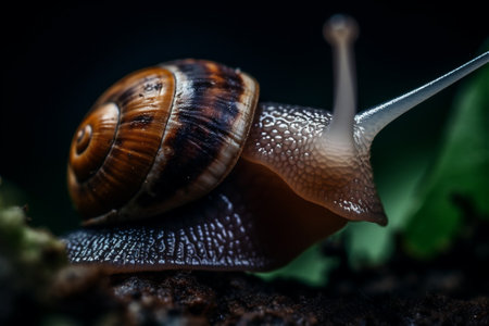 Vibrant snail with a detailed shell is crawling on the earth, amidst lush greenery and gentle sunlight, highlighting the intricate details of nature's wonders, AI generated