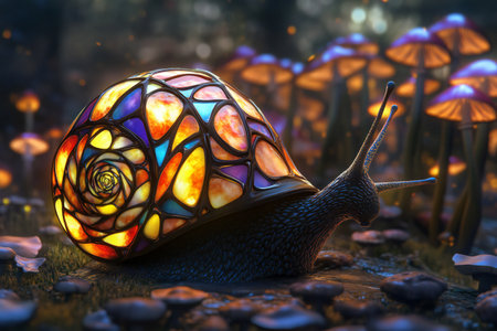 An AI-generated scene featuring a snail with a luminous stained glass shell, moving gently through an enchanted field of enormous mushrooms