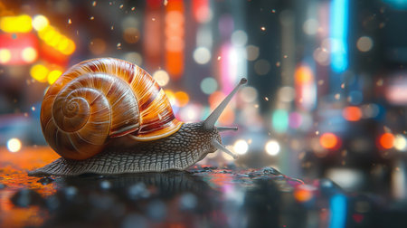 A snail is seen gliding on a wet surface leaving behind a trail of moisture. The creatures spiral shell showcases intricate patterns as it navigates its surroundings