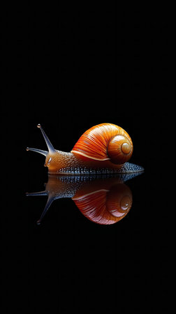 A mesmerizing close-up of a snail with its reflection.