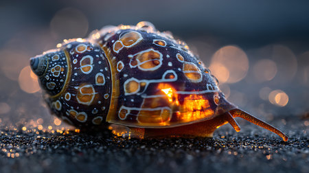 A detailed image presents a snail shell in close-up, revealing its spiral structure and textured surface. The shell displays a gradient of colors, ranging from beige to brown, and is backlit by a soft, warm light of the setting sun. Ideal for illustrating natural patterns or environmental themes and commercial use.