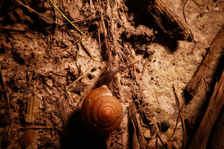 Close up of snail on dark soil in the woods, forest