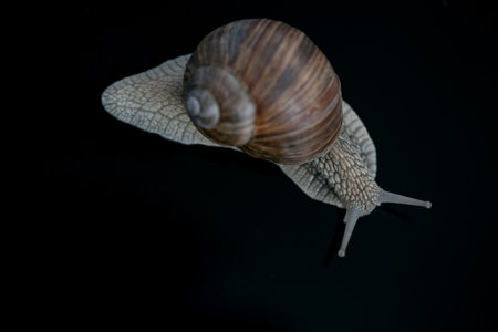 A snail's mesmerizing reflection on a black surface. Macro photography captures its beauty.