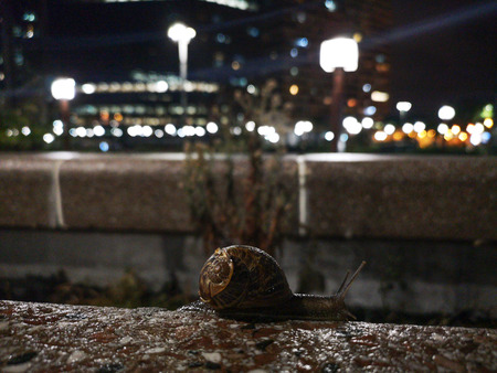 A snail on a table with the reflection of the night.
