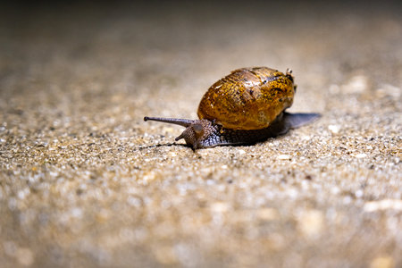 Snail crawling on the road in the garden. Shallow depth of field.