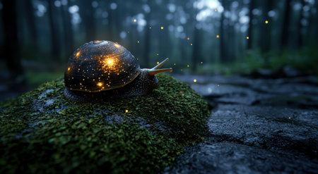 Glowing snail on moss-covered rock in enchanted forest