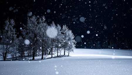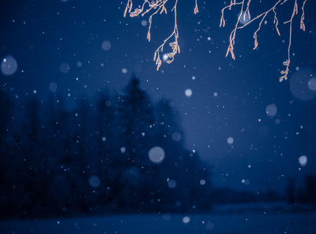 Ethereal Snowfall Bokeh Backdrop Reveals Delicate Patterns of Blurred Lights in Nature at Midnight