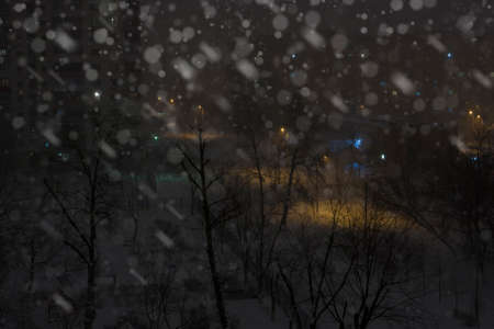 Blurred city at night with snowfall, bokeh effect