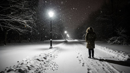 Soft snow falls in a serene forest path during nighttime. Streetlights glow warmly, casting light on the snowy trees and creating a peaceful atmosphere.