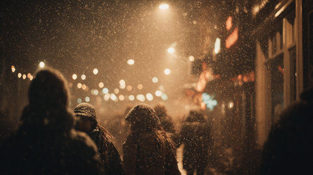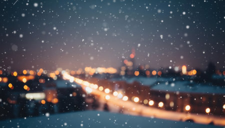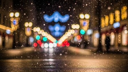 A blurry night scene of a city street with falling snow and vibrant, out-of-focus bokeh lights creating a magical...