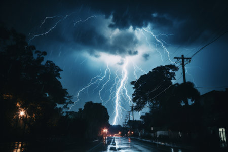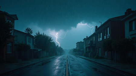 A striking image of a storm with dramatic lightning illuminating a desolate street at night, creating a captivating blend of nature's power and urban serenity.