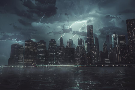 A city skyline with numerous lightning strikes illuminating the sky during a storm, A moody city skyline under a stormy sky, with lightning illuminating the towering buildings