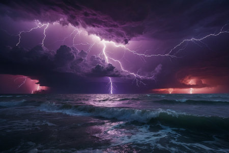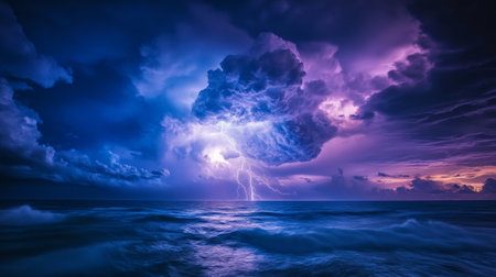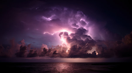 Dramatic thunderstorm over ocean with lightning, powerful nature concept