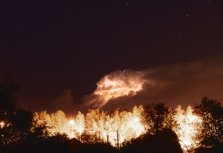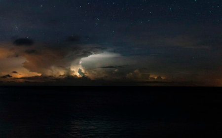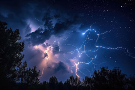 Majestic storm clouds illuminated by lightning create dramatic night sky filled with stars. scene captures beauty and power of nature, evoking sense of awe and wonder