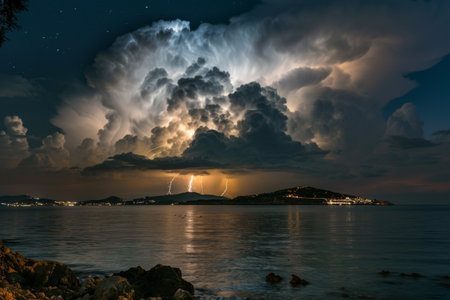 Lightning illuminated storm clouds over a serene sea and a distant illuminated island