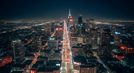 Aerial view of downtown Los Angeles skyline at night, California, USA.