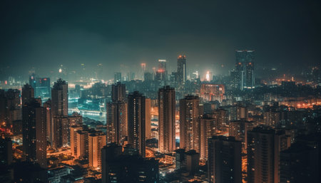 Glowing skyscrapers illuminate the modern city skyline generated by artificial intelligence