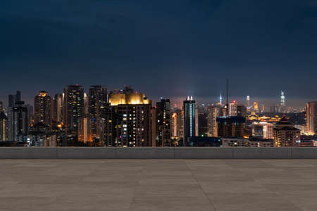 Panoramic Kuala Lumpur skyline view, concrete observatory deck on rooftop, night. Asian corporate and residential lifestyle. Financial city downtown, real estate. Product display mockup empty roof