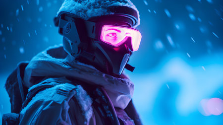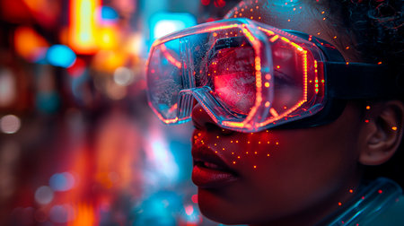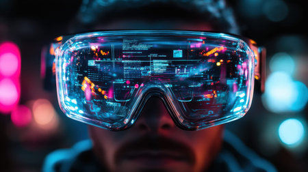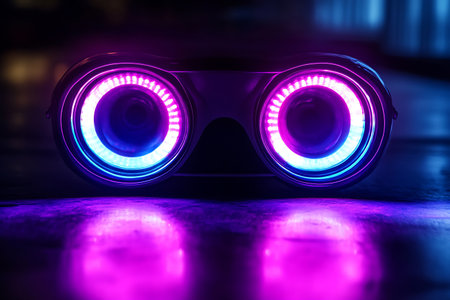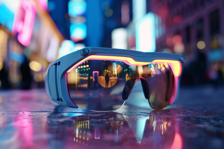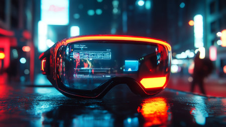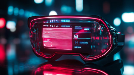 Close-up of futuristic goggles featuring advanced augmented reality technology with vibrant neon colors