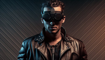 Futuristic cyborg wearing protective eyewear watches virtual reality simulator generated by artificial intelligence