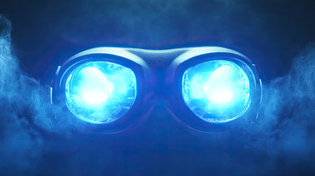 This striking image features futuristic goggles illuminated by bright blue lights, surrounded by a dramatic smoke backdrop, ideal for technology themes.