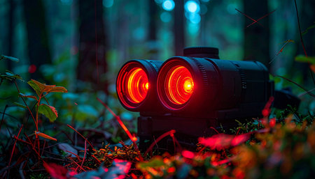 Hidden on the forest floor at twilight, a pair of advanced night vision binoculars emits a mysterious red glow. The powerful optics scan the darkened woods, a symbol of stealth surveillance, secret missions, and the cutting edge of observation technology.