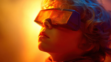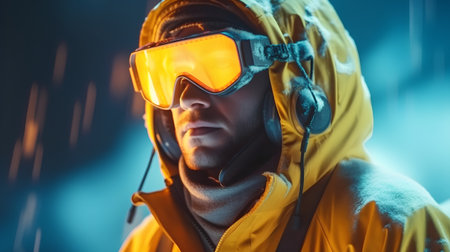 A person is wearing yellow-tinted protective goggles, showcasing a thoughtful expression. The background features vivid blue and orange lighting, creating an engaging atmosphere