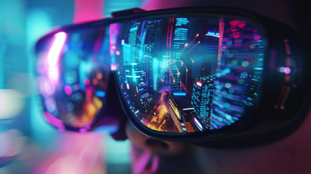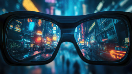 Pair of augmented reality glasses are reflecting the neon city lights of a futuristic city at night