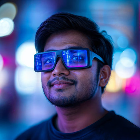 A man stands confidently in holographic glasses, surrounded by colorful light trails in an urban night setting, showcasing modern style and technology.