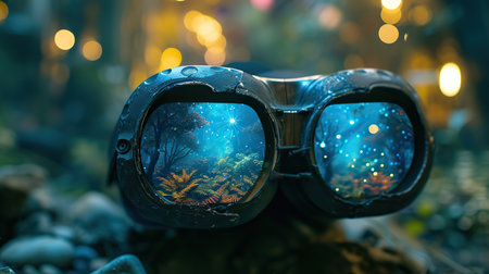 Virtual reality goggles rest on a natural backdrop, showing a magical forest scene on their screens, blending technology with nature.